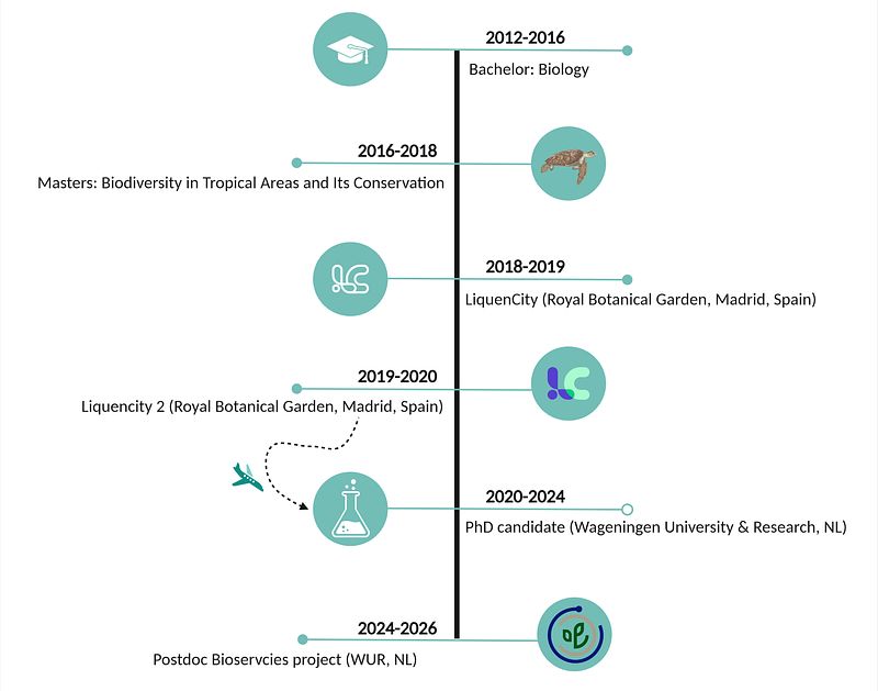 After my master, my scientific path continued with lichens as the main study object, but this time as a coordinator of two very cool citizen science projects named LiquenCity and Liquencity 2!. During these exciting two years (although one was characterized by the presence of the coronavirus pandemic), we were able to transmit knowledge about the bioindicator power of lichens on air quality in the schools of Madrid and Barcelona.